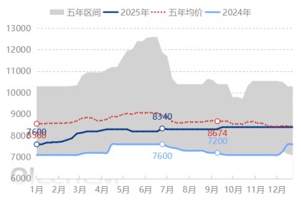 2025年中國(guó)酯基生物柴油產(chǎn)品價(jià)格波動(dòng)在7600-8400元/噸,振幅11%。年度價(jià)格高點(diǎn)在9月,低點(diǎn)在1月。年均價(jià)格在8214元/噸,較于2024年的年度價(jià)格7285元/噸,上漲929元/噸,漲幅達(dá)12.75%。